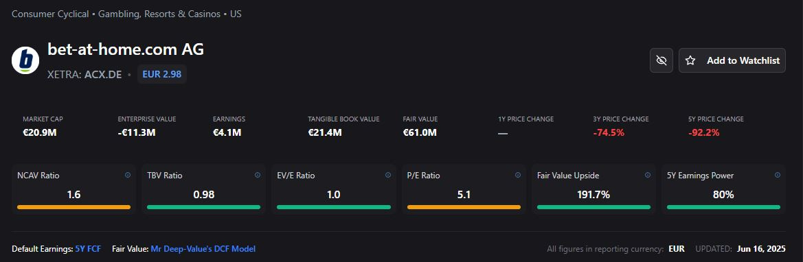 The business in question is bet-at-home.com AG (XETRA: ACX.DE), a Düsseldorf-based online gambling operator founded in 1999.