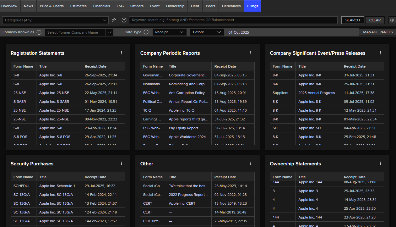 You can also access detailed information on directors, upcoming corporate events and releases, ownership information, debt structure, available derivatives, and downloadable filings.