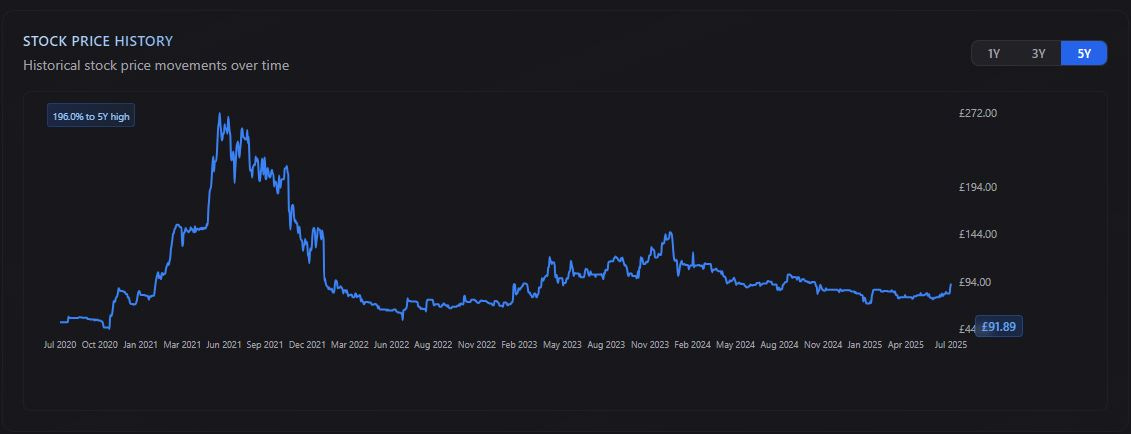The stock price dropped from its 5-year peak of £2.60 down to around £0.71 by early 2025.