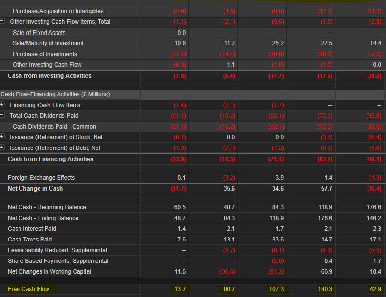 Finally, I had a look at the free-cash-flow. Over the past 5 years it’d averaged around £70mn per YEAR.