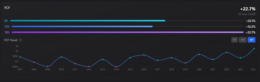 FCF has been consistently profitable (90% of the time) over the last decade.